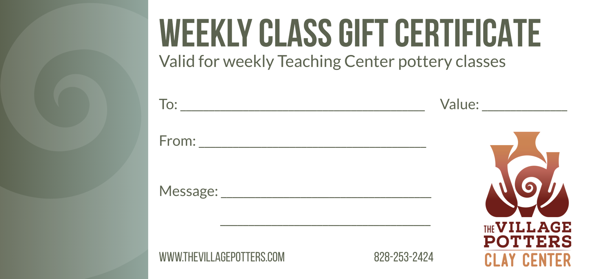 This gift certificate may be redeemed at The Village Potters Clay Center for weekly Teaching Center classes only. It is not valid for workshops, special events, studio fees, firings, retail purchases, or pottery supplies. Class registration is required and subject to availability. Gift certificates have no cash value and are not redeemable for cash or refunds, and they may not be applied to prior purchases. Gift certificates are intended to be used toward a single class registration.